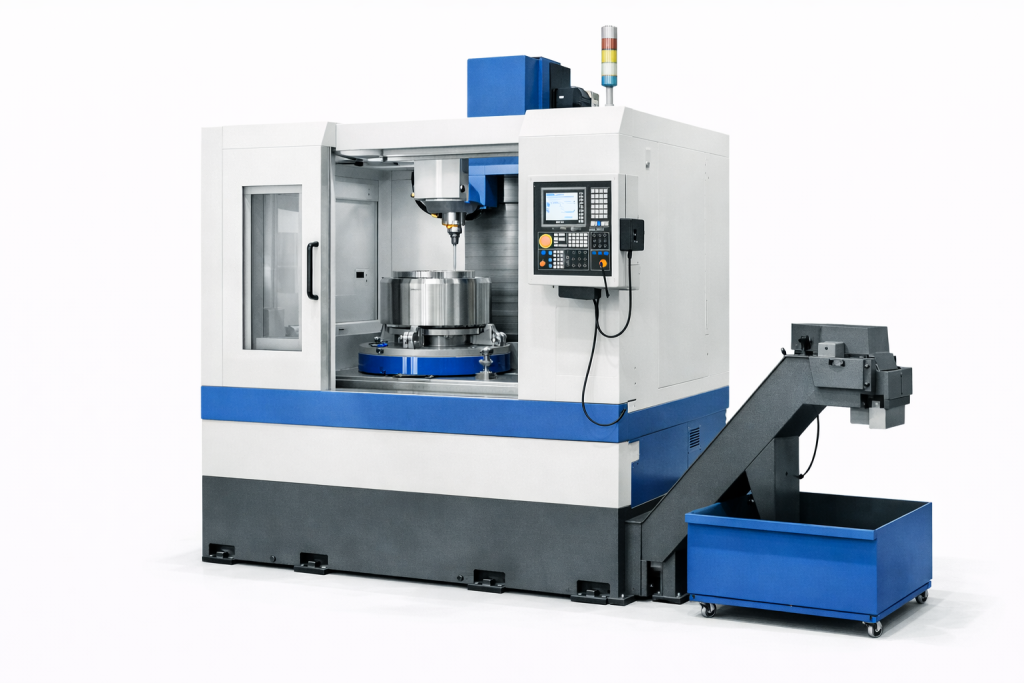Vertical spindle orientation allows gravity-assisted clamping and stable machining of large workpieces with high accuracy.